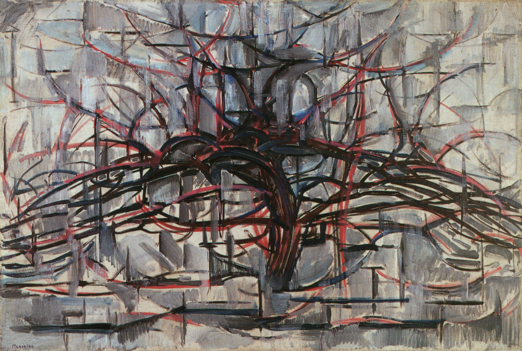 En 1908 pinta Árbol rojo, un cuadro que podría entrar en un paradigma Fauvista. Representa un árbol, una estructura aparentemente caótica pero que responde a principios fractales, de génesis y organizativos. Mondrian los recoge con una pincelada suelta próxima a van Gogh. Las ramas se entrecruzan generando una suerte de retícula.